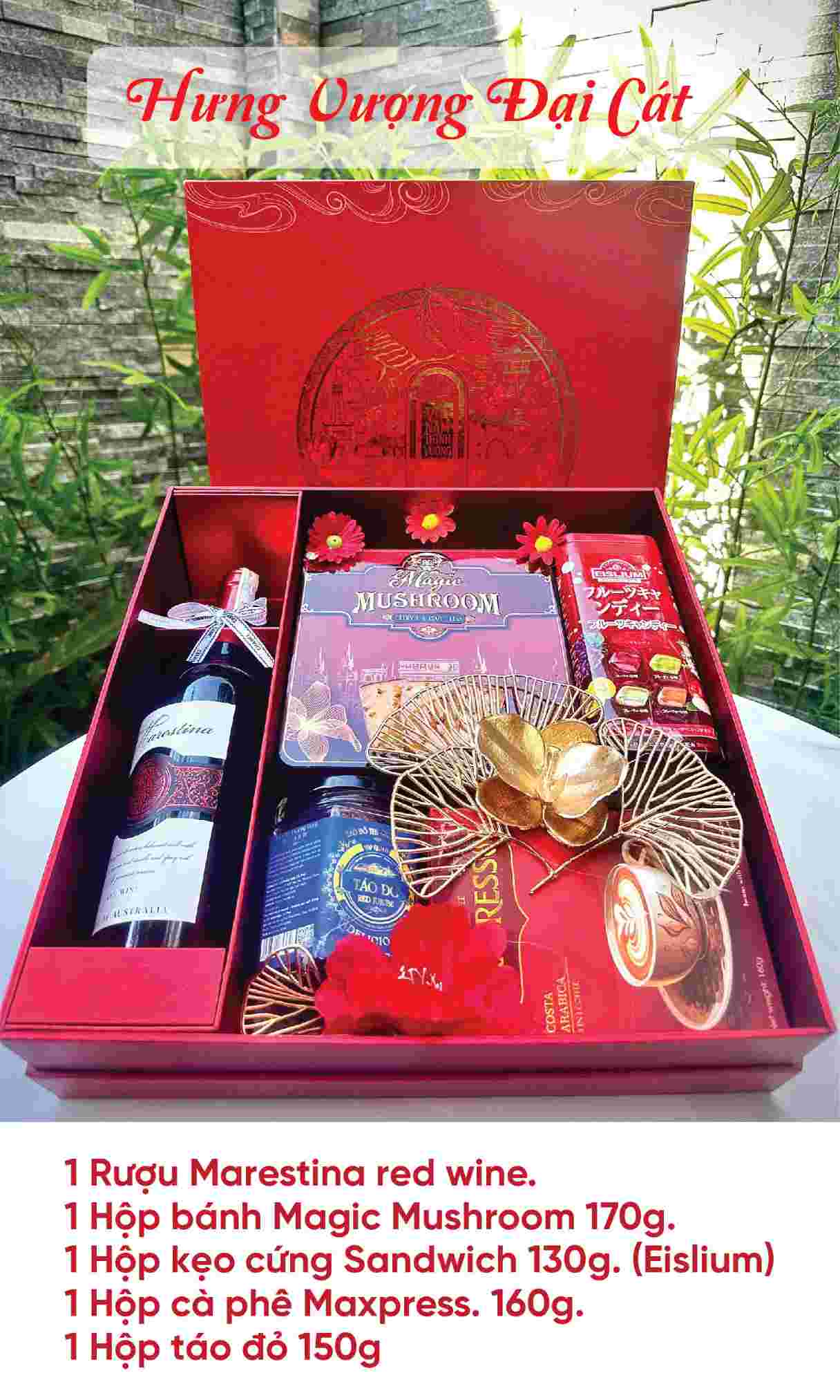 Bộ quà Tết Hưng Vượng Đại Cát gồm rượu vang, cà phê, bánh kẹo cao cấp – lựa chọn quà Tết doanh nghiệp ý nghĩa.