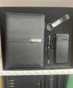 Bộ quà tặng doanh nghiệp gồm sổ da, bút ký, móc khóa và pin sạc dự phòng cao cấp. Quà tặng tri ân khách hàng, đối tác, hội nghị sang trọng.