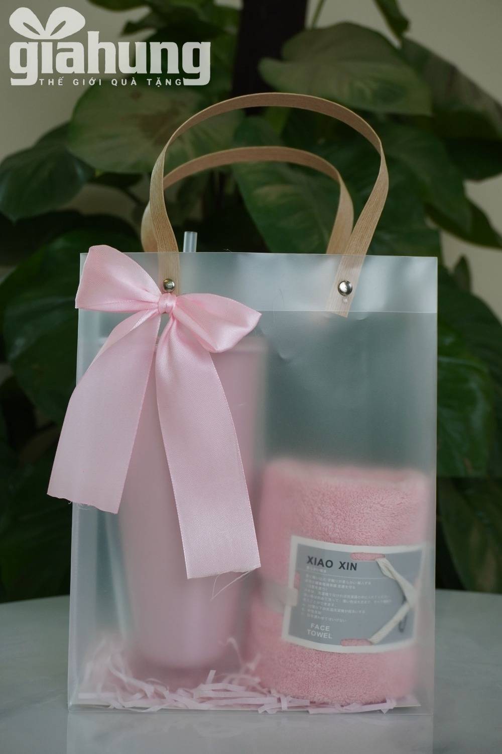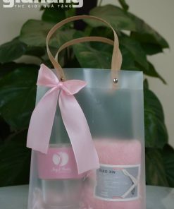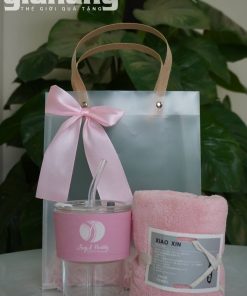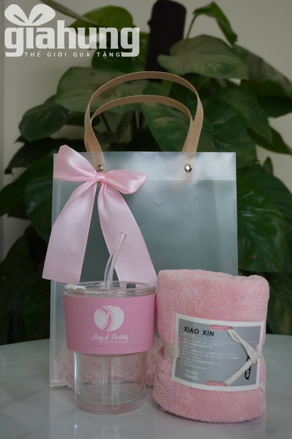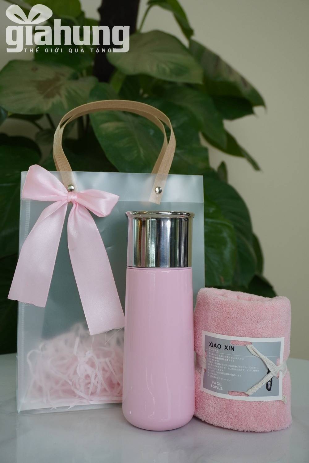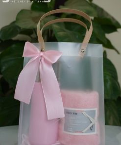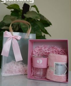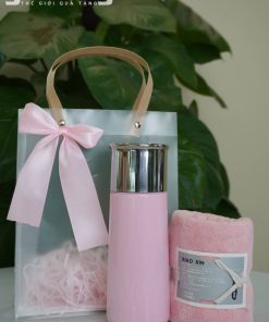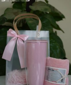 Bộ quà tặng doanh nghiệp tone hồng gồm cốc nước và khăn mặt cao cấp, thiết kế sang trọng, phù hợp quà tặng khách hàng nữ, spa, mỹ phẩm, sự kiện.