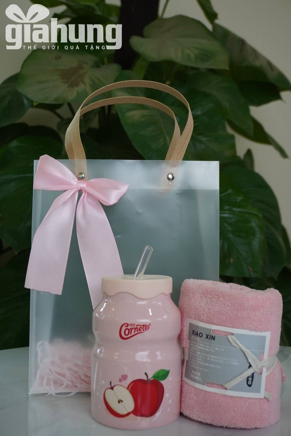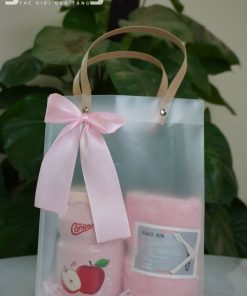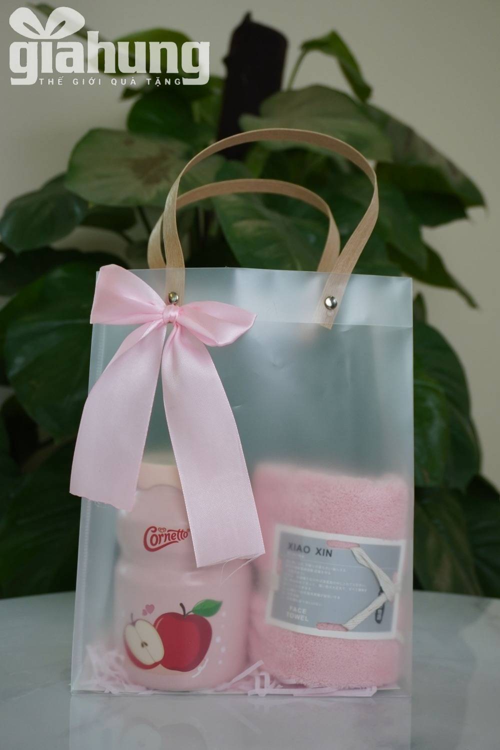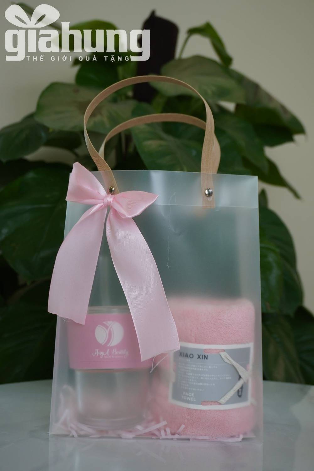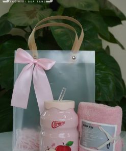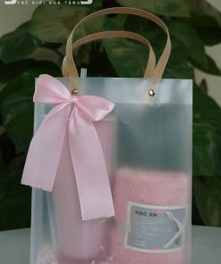 Bộ quà tặng doanh nghiệp tone hồng gồm cốc nước và khăn mặt cao cấp, thiết kế sang trọng, phù hợp quà tặng khách hàng nữ, spa, mỹ phẩm, sự kiện.