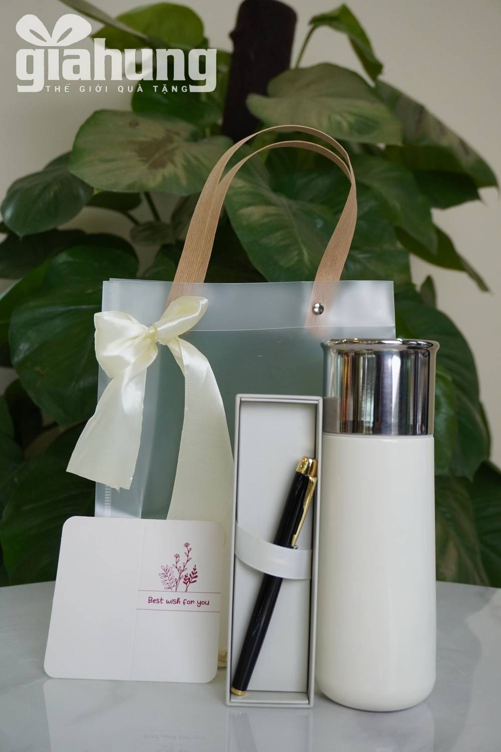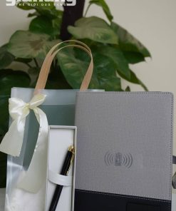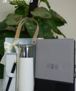 Set quà tặng doanh nghiệp cao cấp gồm bình giữ nhiệt, sổ tay sạc không dây, bút kim loại. Nhận in logo theo yêu cầu, sang trọng & chuyên nghiệp.