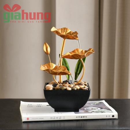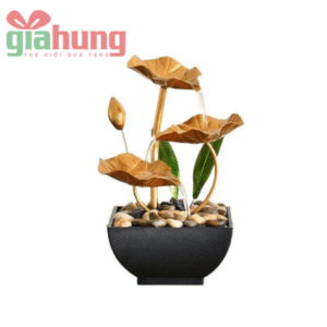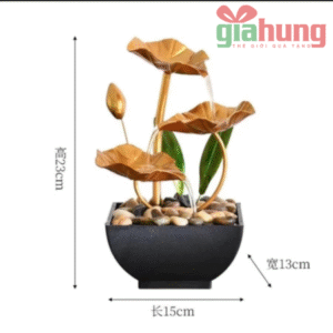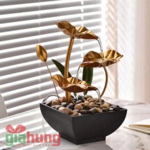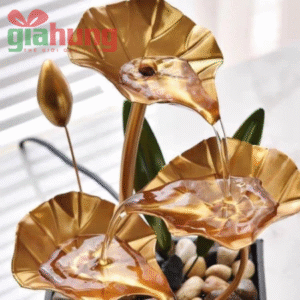 Thác nước hoa sen để bàn bằng kim loại sơn vàng tinh tế, trang trí phòng làm việc, kệ sách hoặc không gian thiền – mang ý nghĩa phong thủy, may mắn và bình an