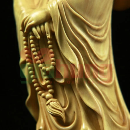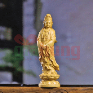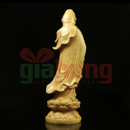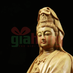 Tượng Quán Thế Âm Bồ Tát gỗ hoàng dương, vân gỗ đẹp, thần thái an yên – phù hợp thờ cúng, trưng bày phong thủy hoặc làm quà tặng tâm linh cao cấp.